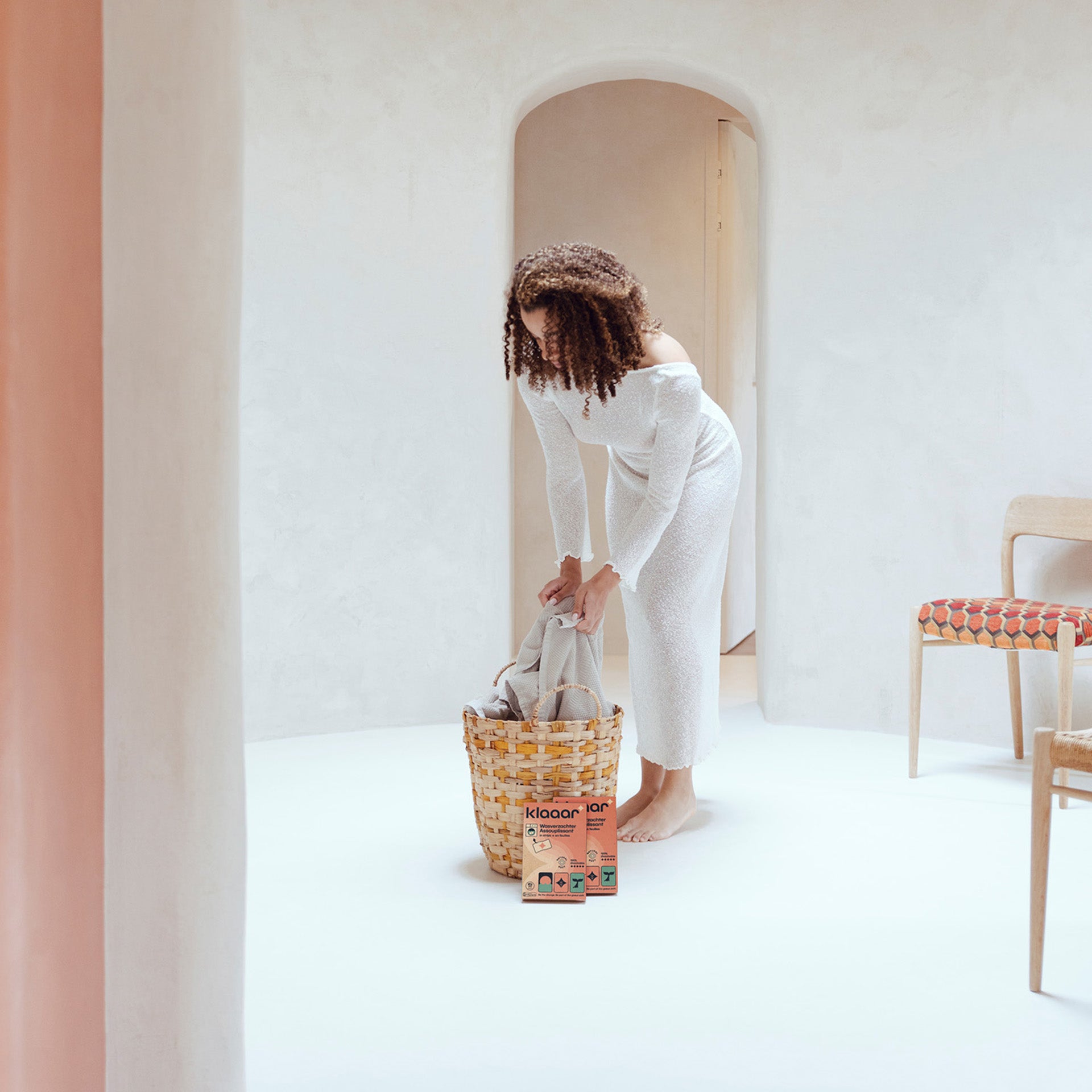 Gentle on your laundry, smart for the planet. Klaaar fabric softener sheets soften your clothes naturally thanks to an innovative formula without silicones, microplastics, or unnecessary additives. They're super compact, plastic-free, and completely soluble. And your laundry smells wonderfully fresh. Good for your clothes and the planet.